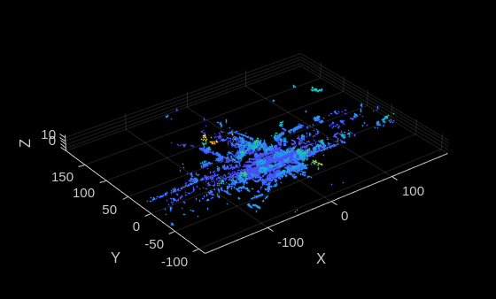 Note: The terrestrial point cloud registration process builds a map of the scene traversed by the vehicle. Although the map might appear locally consistent with reference to the first point cloud in the sequence, you might observe a significant drift over the entire sequence. If you have the Inertial Measurement Unit (IMU) and GPS data for each point cloud in the sequence, you can use it to improve the performance of the point cloud registration. For more information, see the Build a Map from Lidar Data example.