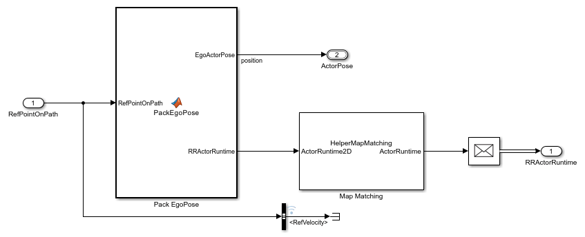 Path Action— RoadRunner Scenario Reader block that reads the reference path of the ego vehicle.All Actor Runtime— RoadRunner Scenario Reader block that reads runtime information of all the vehicles.Self Actor Runtime Reader— RoadRunner Scenario Reader block that reads ego actor runtime information.Self Actor Runtime Writer— RoadRunner Scenario Writer block that writes the ego vehicle runtime to RoadRunner Scenario.