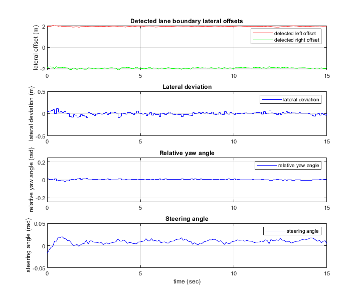 The Relative yaw angle plot shows the relative yaw angle between the ego vehicle and the centerline of the lane. The relative yaw angle is very close to 0 radians, which implies that the heading angle of the ego vehicle matches the yaw angle of the centerline closely.