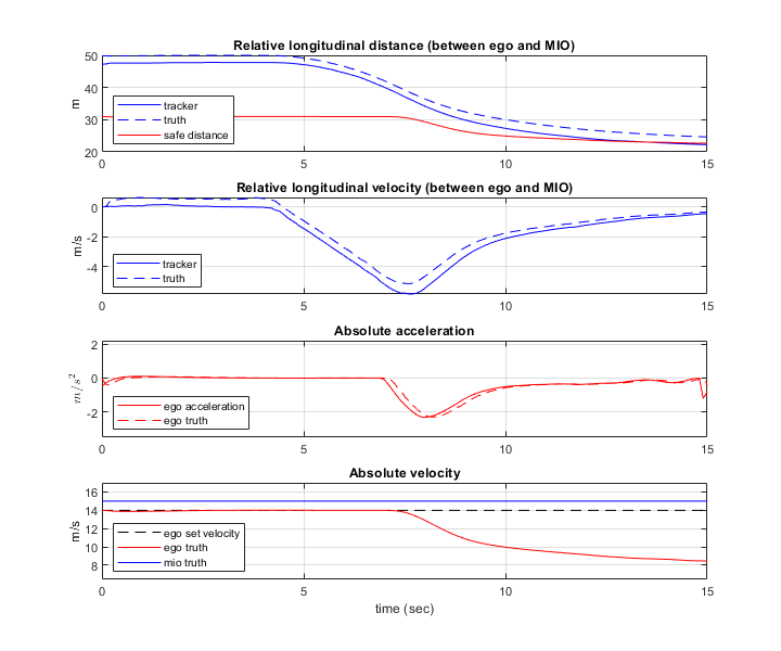 The Relative longitudinal velocity plot shows the relative velocity between the ego vehicle and the MIO. In this example, the vehicle detector detects only positions, so the tracker in the control algorithm estimates the velocity. The estimated velocity is less than the actual (ground truth) MIO relative velocity.