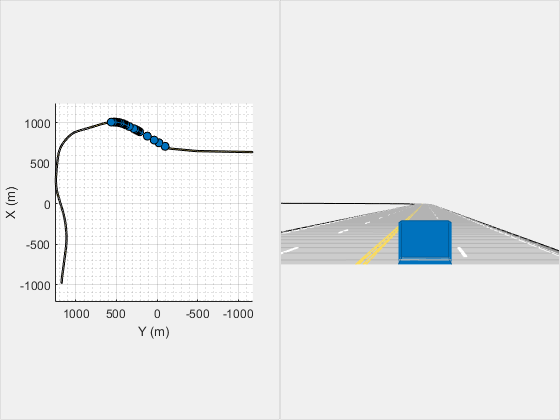 hFigScenario = figure; p1 = uipanel("Position",[0 0 0.5 1]); h1 = axes("Parent",p1); plot(scenario,"Waypoints","On","Parent",h1); p2 = uipanel("Position",[0.5 0 0.5 1]); h2 = axes("Parent",p2); chasePlot(scenario.Actors(1),"Parent",h2)