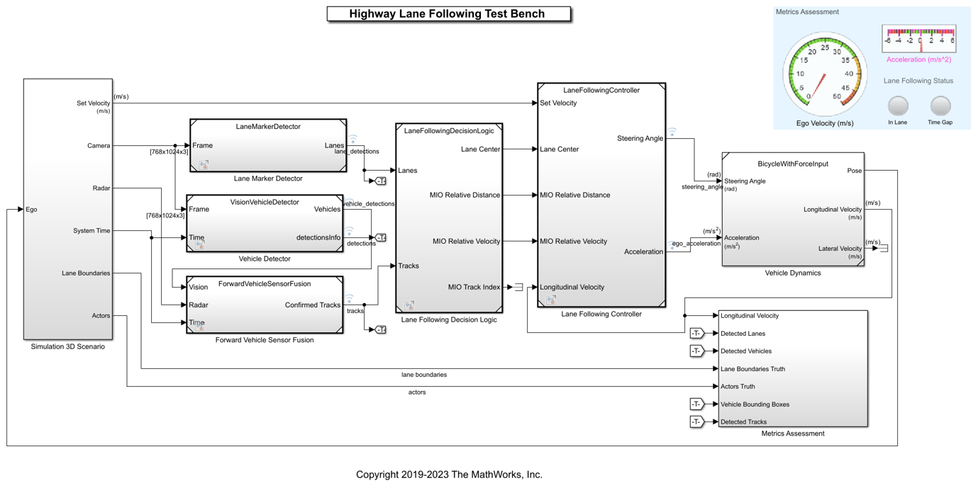 You can reuse the techniques described in the previous sections to simulate and assess a closed-loop system such as the highway lane following application. This section reuses models, helper functions, and techniques described in the Highway Lane Following example.