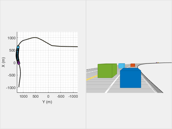 hFigScenario = figure; p1 = uipanel("Position",[0 0 0.5 1]); h1 = axes("Parent",p1); plot(scenario,"Waypoints","On","Parent",h1); p2 = uipanel("Position",[0.5 0 0.5 1]); h2 = axes("Parent",p2); chasePlot(v,"Parent",h2);