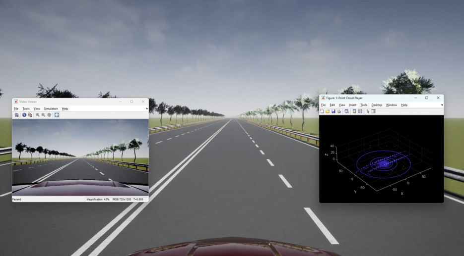 The model also contains blocks to visualize the camera and lidar sensors. You can use the Bird's-Eye Scope to visualize radar and vision detections from a bird's-eye view. To learn how to configure this scope, see Visualize Sensor Data from Unreal Engine Simulation Environment.