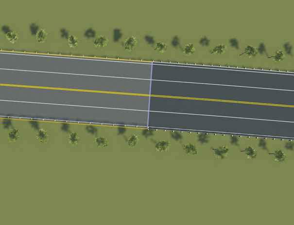 scenario_RRHighway_02_DashedToSolidMarkingsfunction configures the test scenario such that the ego vehicle navigates from Section 4 to Section 5 of the scene. This enables testing the lane following application for the transition from dashed lane markings to solid lane markings.scenario_RRHighway_03_DarkToLightRoadMaterialfunction configures the test scenario such that the ego vehicle navigates from Section 5 to Section 6 of the scene. This enables testing the lane following application for the transition from darker textured road material to lighter textured road material.