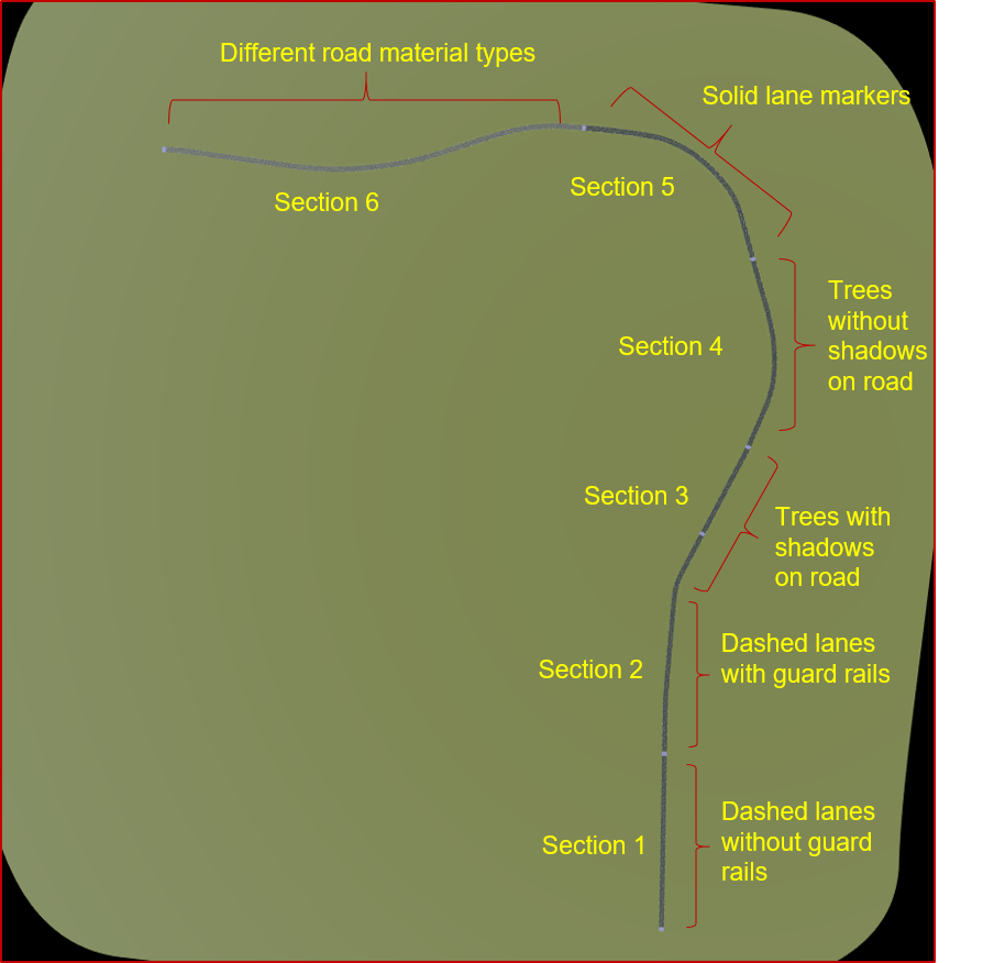 This scene is designed to pose challenges to the lane following system. This image shows that the road network is divided into six sections. Each section incrementally adds variations to the scene as follows: