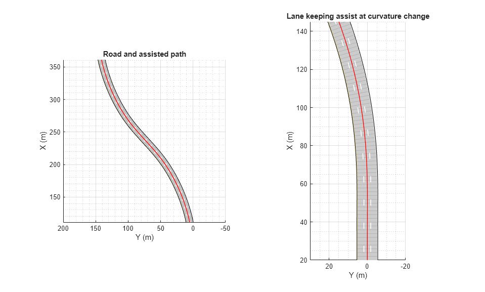 The blue curve for the driver path shows that the distracted driver may drive the ego vehicle to another lane when the road curvature changes. The red curve for the driver with Lane Keeping Assist shows that the ego vehicle remains in its lane when the road curvature changes.