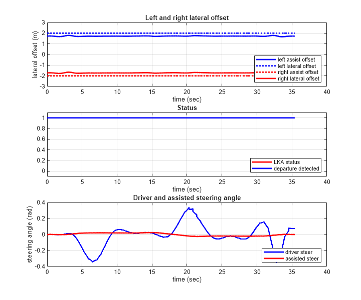 • Top plot shows the left and right lane offset. Around 5.5 s, 19 s, 31 s, and 33 s, the lateral offset is within the distance set by the lane keeping assist. When this happens, the lane departure is detected.