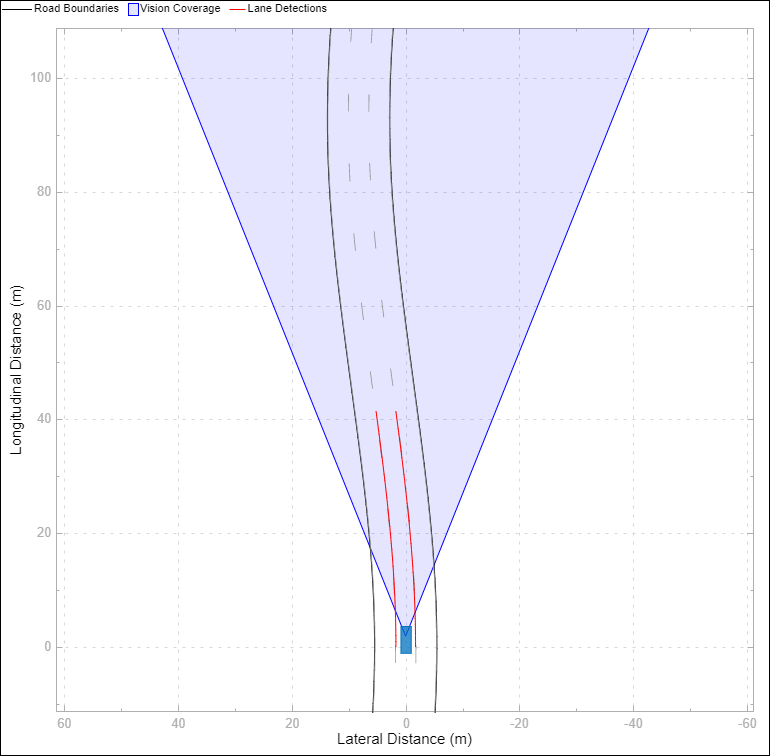 The Bird's-Eye Scope shows a symbolic representation of the road from the perspective of the ego vehicle. In this example, the Bird's-Eye Scope renders the coverage area of the synthetic vision detector as a shaded area. The ideal lane markings are additionally shown, as well as the synthetically detected left and right lane boundaries (shown here in red).