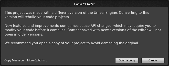 3. Follow the prompts to open a copy of the project. The editor creates a new project folder in the same location as the original, appended with 5.3. Close the editor.