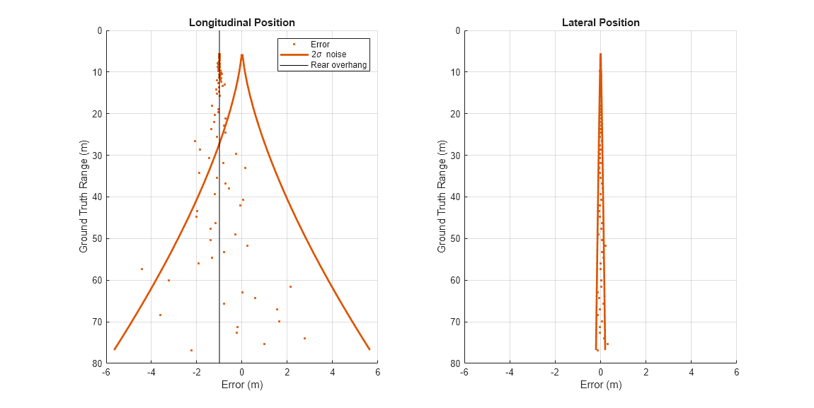 helperPlotSensorDemoDetections(metrics, 'position', 'reverse range', [-6 6]); % Show rear overhang of target vehicle tgtCar = scenario.Actors(2); rearOverhang = tgtCar.RearOverhang; subplot(1,2,1); hold on; plot(-rearOverhang*[1 1], ylim, 'k'); hold off; legend('Error', '2\sigma noise', 'Rear overhang');