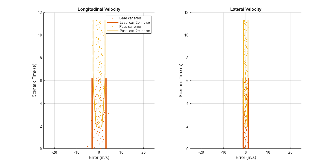 The longitudinal velocity errors from the passing vehicle scenario are shown in the preceding plot on the left. Because the lead car maintains a constant distance from the vision sensor, its errors (displayed as red points) show the same