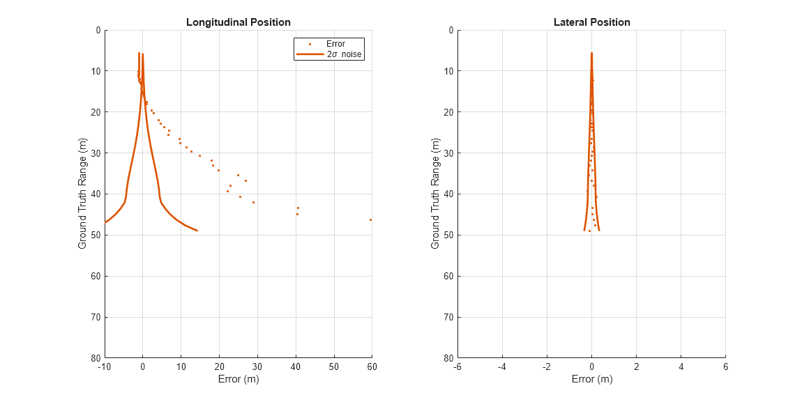 An object's vertical position in the image is strongly correlated to the object's height above the road, but it is weakly correlated to the object's distance from the camera. This weak correlation causes a monocular vision sensor's longitudinal position errors to become large as an object moves away from the sensor. The longitudinal position errors in the preceding plot on the left show how the sensor's longitudinal errors quickly increase when the target vehicle is far from the sensor. The sensor's longitudinal