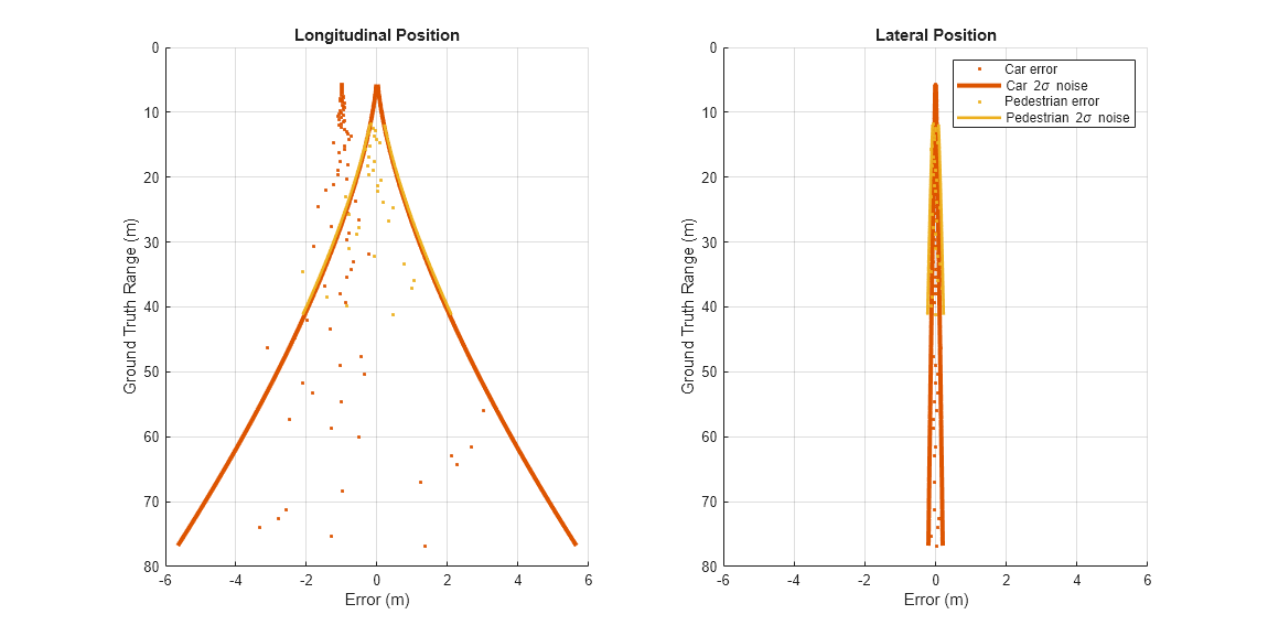 helperPlotSensorDemoDetections(metrics, 'position', 'reverse range', [-6 6]); legend('Car error','Car 2\sigma noise', 'Pedestrian error', 'Pedestrian 2\sigma noise');