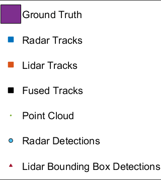 This visualization shows track fusion at a single time step. The fused tracks are closer to the actual objects than the individual sensor tracks, which indicates that track accuracy increased after fusion of track estimates from both sensors.
