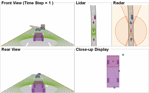 The scenario recording for this example is captured from the scenario described in Track-Level Fusion of Radar and Lidar Data (Sensor Fusion and Tracking Toolbox) MATLAB example. The Scenario Reader block reads a prerecorded scenario file and generates actors and ego vehicle position data as Simulink.Bus (Simulink) objects. In this scenario, the ego vehicle is mounted with four 2-D radar sensors. The front and rear radar sensors have a field of view of 45 degrees. The left and right radar sensors have a field of view of 150 degrees. Each radar has a resolution of 6 degrees in azimuth and 2.5 meters in range. The ego vehicle is also mounted with one 3-D lidar sensor with a field of view of 360 degrees in azimuth and 40 degrees in elevation. The lidar has a resolution of 0.2 degrees in azimuth and 1.25 degrees in elevation (32 elevation channels). The Radar Detection Generator block generates radar detections and the Lidar Point Cloud Generator block generates point clouds. Detections from all four radar sensors are grouped together with the Detection Concatenation block and the Digital Clock block is used to simulate time. Sensor configurations and the simulated sensor data is visualized in the animation that follows. Notice that the radars have higher resolution than objects and therefore return multiple measurements per object. Also notice that the lidar interacts with the actors as well as the road surface to return multiple points.