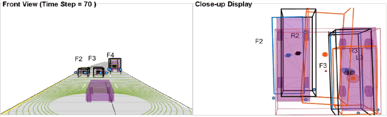This visualization shows radar tracking at a single time step. Notice that the radar sensors report multiple detections per object and the GM-PHD tracker forms two-dimensional rectangular tracks corresponding to each object.