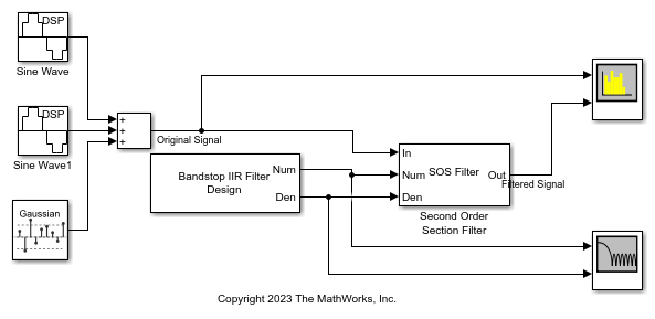 Filter a noisy sinusoidal signal using the Second-Order Section Filter block. Obtain the numerator and denominator coefficients of the SOS filter using the Bandstop IIR Filter Design block.
