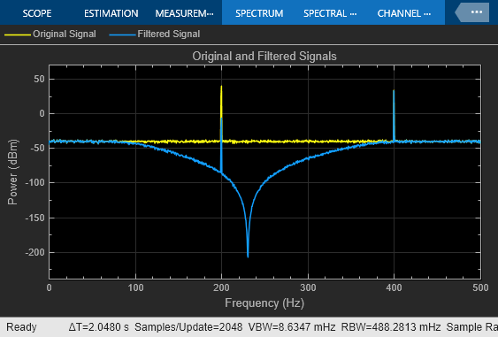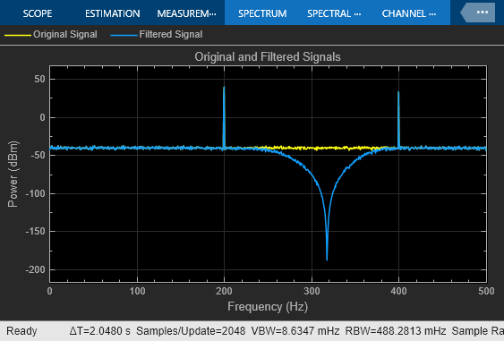 The Second-Order Section Filter block filters the noisy sinusoidal signal. Visualize the original sinusoidal signal and the filtered signal using the Spectrum Analyzer. The first tone is attenuated as it falls in the stopband region of the filter while the second tone remains unaffected as it falls in the passband region of the filter.