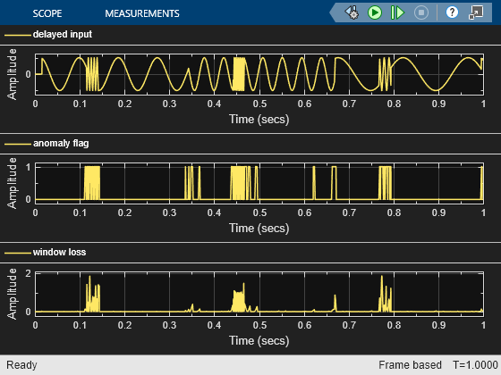 Observe from the time scope that the presence of an anomaly is uniform across all channels and the block provides a single-channel output for the window loss and anomaly flag, corresponding to all the channels of the input.