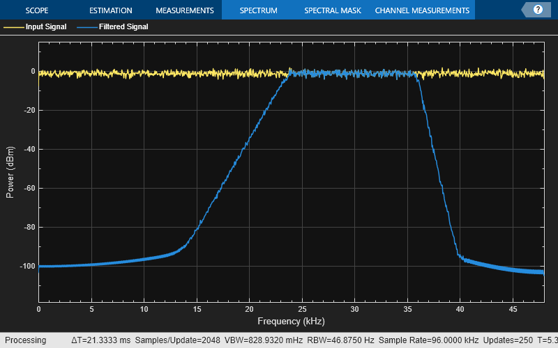 Stream in random data and filter the signal using the dsp.FourthOrderSectionFilter object. Visualize the spectra of the input and filtered signals using the spectrum analyzer.
