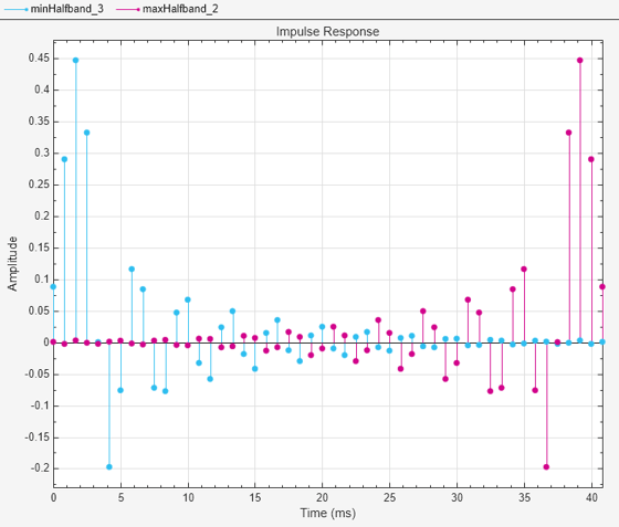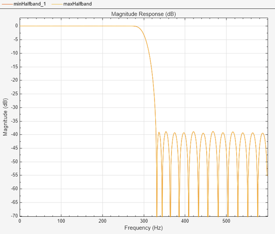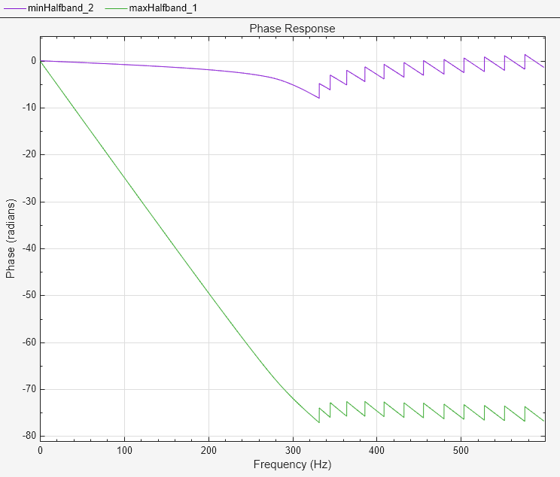 maxHalfband = designHalfbandFIR(FilterOrder=49,... PhaseConstraint='maximum',InputSampleRate=1200,... SystemObject=true,Verbose=true)