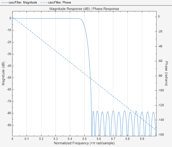 Cascading the minimum- and maximum-phase filters yields a linear phase filter. The magnitude response of the filter cascade is the same as the individual filters but the phase response is linear.