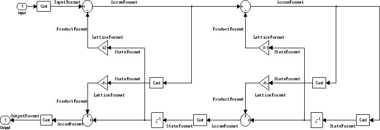 k = [.66 .7 .44]; hd=dfilt.latticeallpass(k); % convert to fixed-point arithmetic hd.arithmetic = 'fixed';