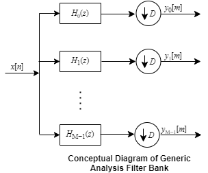 The generic analysis filter bank consists of a series of parallel bandpass filters that split an input broadband signal, x[n], into a series of narrow subbands. Each bandpass filter retains a different portion of the input signal. After the bandwidth is reduced by one of the bandpass filters, the signal is downsampled to a lower sampling rate commensurate with the new bandwidth.
