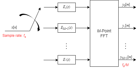 In this configuration, when the first input sample is delivered, the switch feeds this input to branch 0 and the channelizer computes the first set of output values. As more input samples come in, the switch moves in the counterclockwise direction through branches D−1, D−2, all the way up to branch 0, delivering one sample at a time to each branch. When the switch comes to branch 0, the channelizer outputs the next set of output values. This process continues as the data keeps coming in. Every time the switch comes to the first branch 0, the channelizer outputs y0[m], y1[m], … , yM-1[m].
