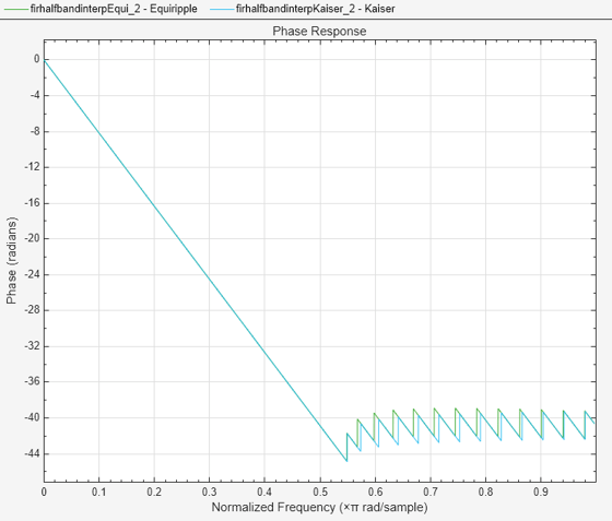 DesignMethodproperty to"Auto", you can determine the method used by the algorithm by examining the passband and stopband ripple characteristics of the designed filter. If the object used the equiripple method, the passband and stopband ripples of the designed filter have a constant amplitude in the frequency response. If the filter design method the object chooses in the"Auto"mode is not suitable for your application, manually specify theDesignMethodas"Equiripple"or"Kaiser"."Equiripple"–– The algorithm uses the equiripple method."Kaiser"–– The algorithm uses the Kaiser window method.