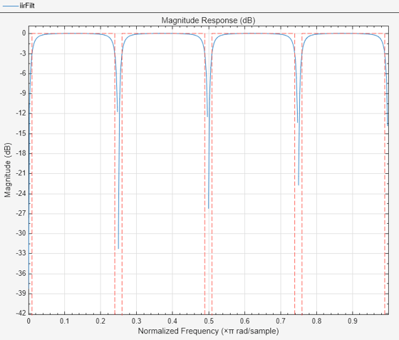for i = 1:5000 input = Sine1()+Sine2()+Sine3()+... 0.01*randn(Sine1.SamplesPerFrame,1); output = iir(input); sa(input,output) end