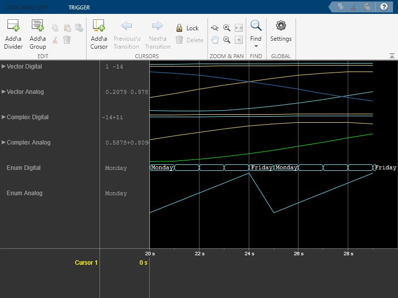 The Logic Analyzer System object™ displays the transitions in time-domain signals. Using dsp.LogicAnalyzer, you can:
