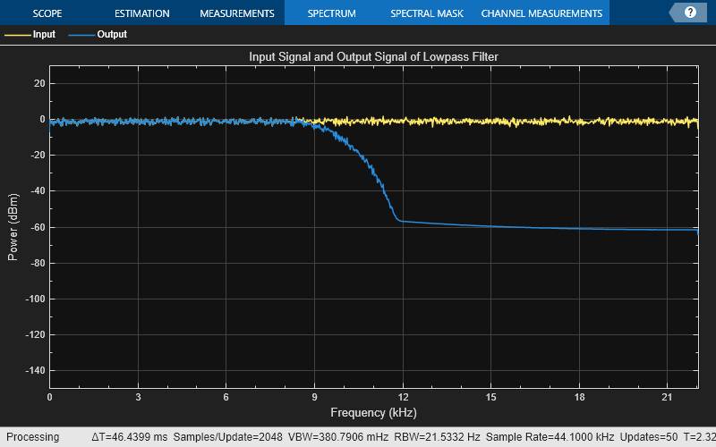 Run the lowpass filter algorithm to filter the white Gaussian noisy input signal. View the input and output signals using the spectrum analyzer.