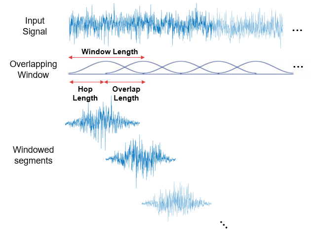 them to the desired window length and overlap length, multiplies the samples by the window,