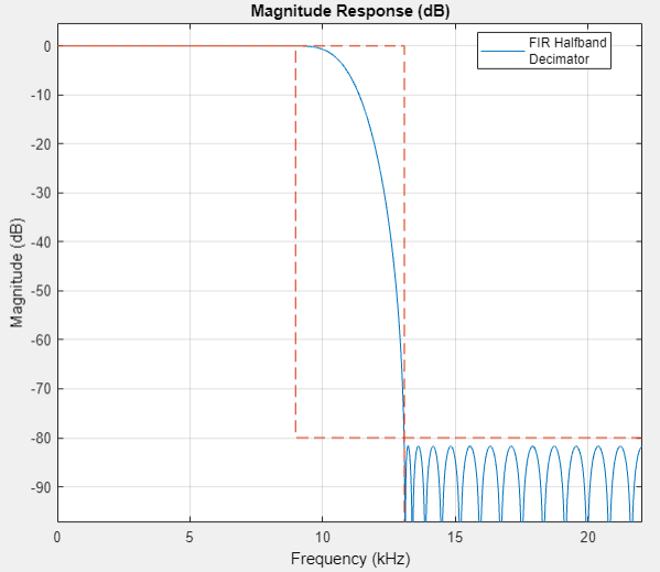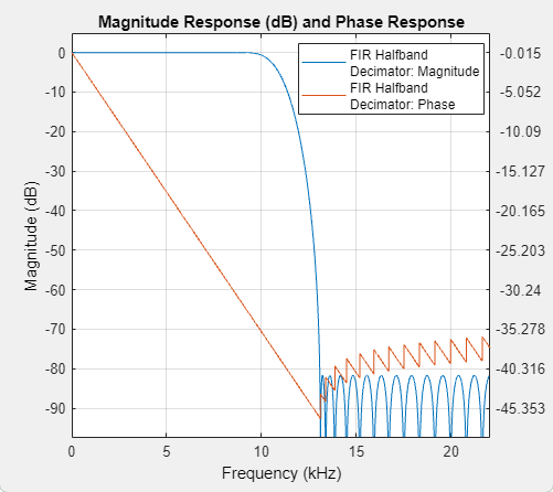 The FIR halfband decimator uses a causal FIR approximation to the ideal halfband response, which is based on minimizing the norm of the error (minimax). See Algorithms for more information.