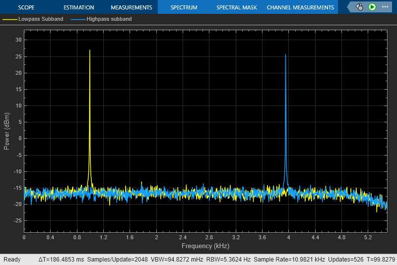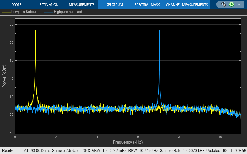 Pass the noisy sinusoidal signal through the decimator. Plot the spectrum of the input and the lowpass and highpass subband outputs in two separate spectrum analyzer windows.
