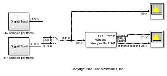 When you input a variable-size signal, the frame length of the signal can be arbitrary, that is, the input frame length does not have to be a multiple of the decimation factor 2. When you input a fixed-size signal (frame length does not change during simulation), the frame length can be arbitrary only when you select the Allow arbitrary frame length for fixed-size input signals parameter. (since R2023b)