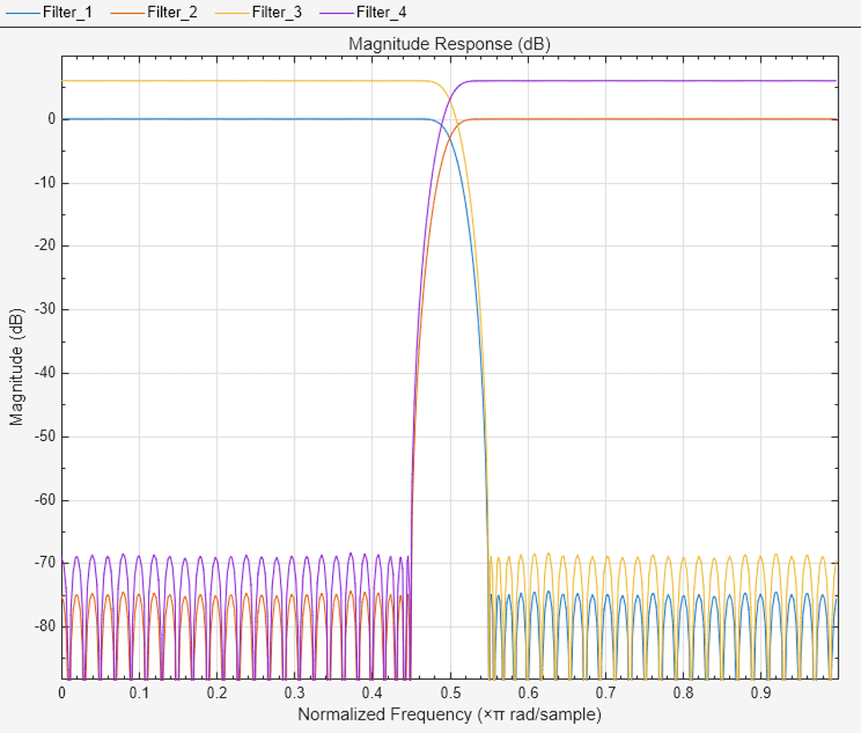 [h0,h1,g0,g1] = firpr2chfb(n,dev,'dev') designs the four filters such that the maximum stopband ripple of h0 is given by the scalar dev. Specify dev in linear units, not decibels. The stopband-ripple of h1 is also be given by dev, while the maximum stopband-ripple for both g0 and g1 is (2*dev).