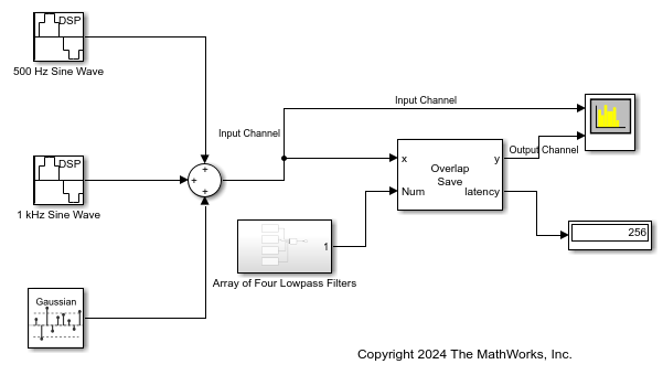 Pass the filter coefficients you design through the Num port of the Frequency-Domain FIR Filter block. The block uses the Overlap-save method by default. Select the Sum filtered output contributions from all input channels parameter.