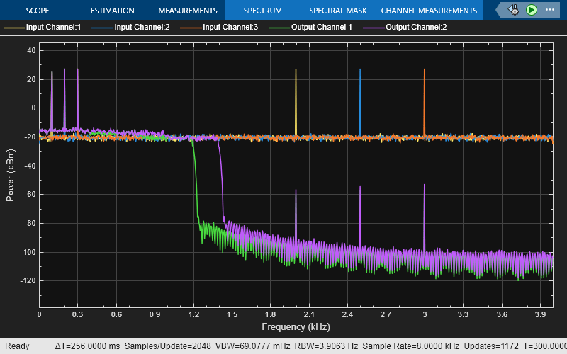 Run the model. Pass the signal through the designed filter. View the spectrum of the input and the filtered output in the spectrum analyzer.