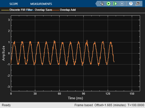 Pass the input signal to the three filters. Account for the output latency of the frequency-domain FIR filters while passing the input to the time-domain FIR filter. View the filtered outputs in the time scope.
