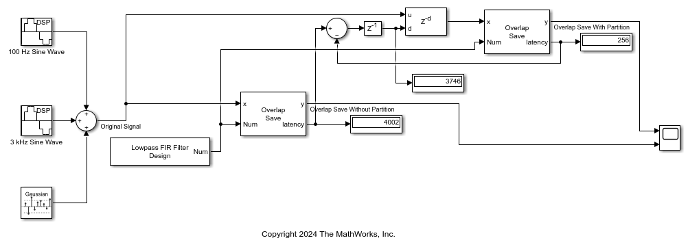 Open the overlapAddSave.slx model. The Lowpass FIR Filter Design block in the model designs the lowpass FIR filter with a filter order of 400 and a cutoff frequency of 0.5 in normalized frequency units. Use the Discrete FIR Filter block and the two Frequency-Domain FIR Filter blocks to filter the input signal using these coefficients.