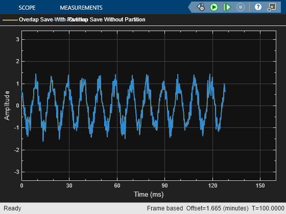 Run the model. Compare the outputs of the two frequency-domain filters in the time scope. To compare the two outputs, delay the input to the partitioned frequency-domain FIR filter by 3746 samples (4002
