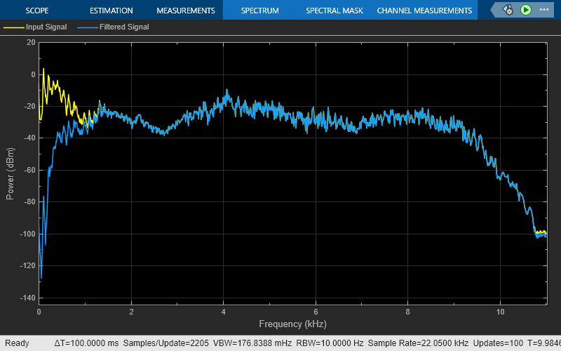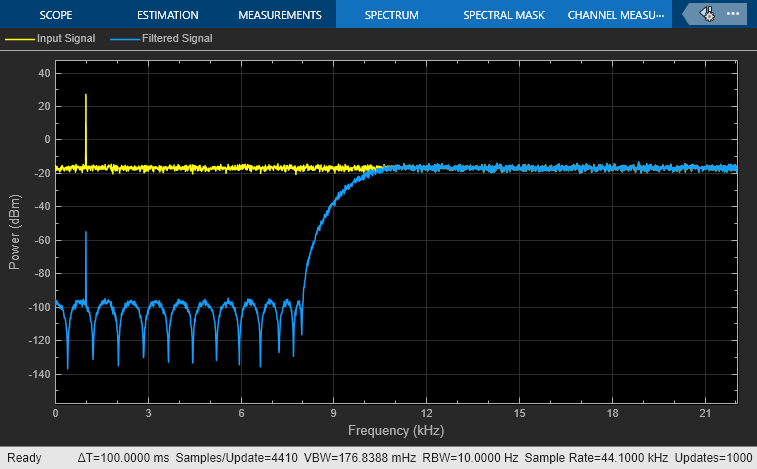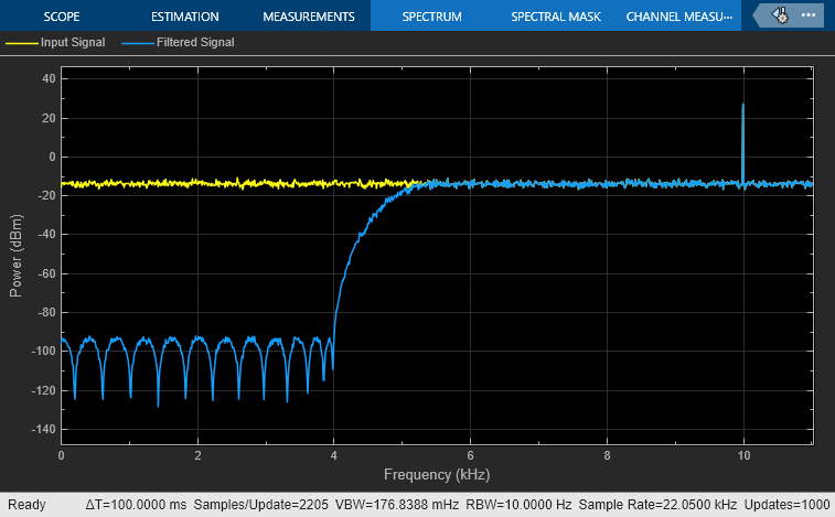 Run the model. View the spectrum of the input signal and the filtered output in the spectrum analyzer.