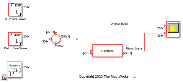 Open and inspect the HighpassFilterSinusoid.slx model. The input is a noisy sinusoidal signal with tones at 1 kHz and 15 kHz. The sample rate of the input signal is 44.1 kHz. The added noise is white Gaussian with a mean of 0 and a variance of 0.05.