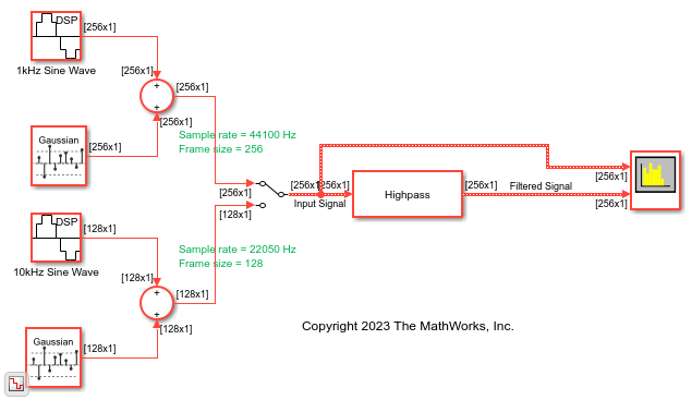 Open and inspect the HighpassFilterVarSizeSinSignal.slx model. The input can be one of the two sinusoidal signals. The first sinusoidal signal is a 1 kHz sine wave with a sample rate of 44100 Hz and a frame size of 256. The second sinusoidal signal is a 10 kHz sine wave with a sample rate of 22050 Hz and a frame size of 128. The frame period of both the signals is the same (256/44100 or 128/22050). For more information on sample rate and frame period, see Sample- and Frame-Based Concepts. Using a manual switch, you can control which sine wave is input to the Highpass Filter block.