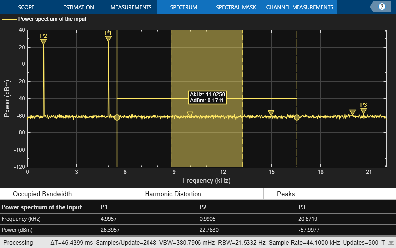 peaks in the scope. The scope computes and displays peaks for only the portion of the input