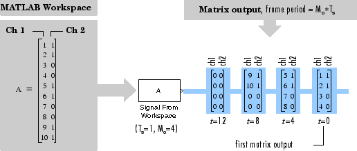 Unlike the Simulink From Workspace (Simulink) block, the Signal From Workspace block holds the output value constant between successive output frames (that is, no linear interpolation takes place). Also, the initial signal values are always produced immediately at t=0.
