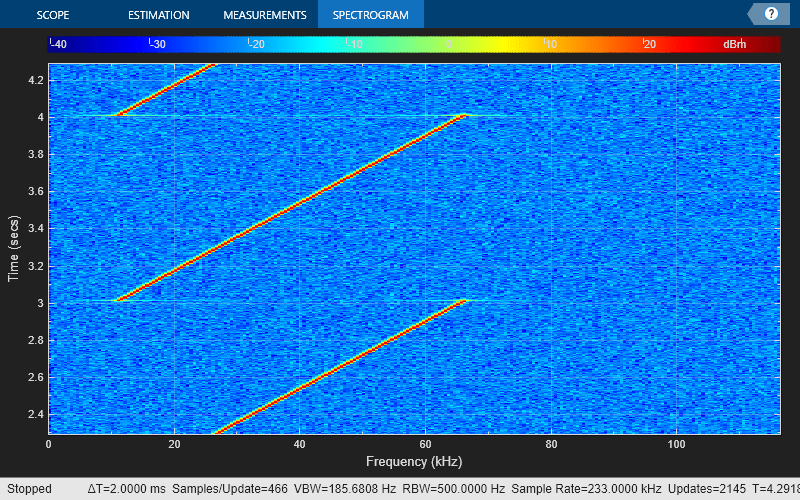 • "spectrogram" — Display the spectrogram of signals. Spectrogram shows the frequency content over time. Each line of the spectrogram is one periodogram. Time scrolls from the top to the bottom of the display. The most recent spectrogram update is at the top of the display.